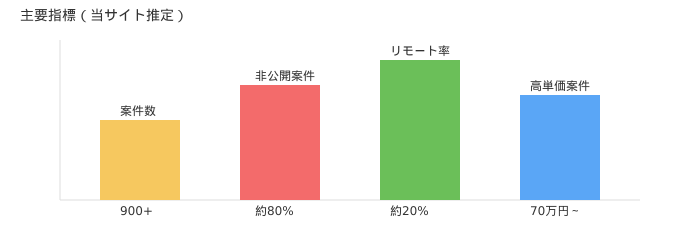 レバテックやMidworksなどと比べると、公開案件数は少なめ(約900件前後)です。ただし、非公開案件比率が80%以上とされており、登録後の紹介でカバーできるケースも多いです。